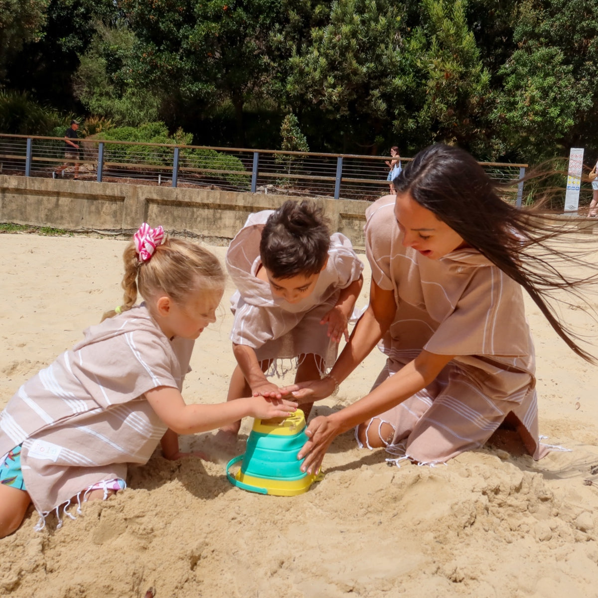 From colourful boardshorts, to light and cozy kids hooded poncho beach towels, make your holidays fun and easy!
