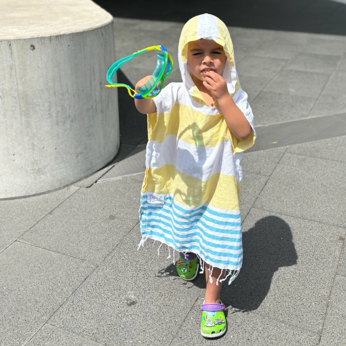Introducing the Yellow and Blue Kids Hooded Beach Towel from Tolu Australia.