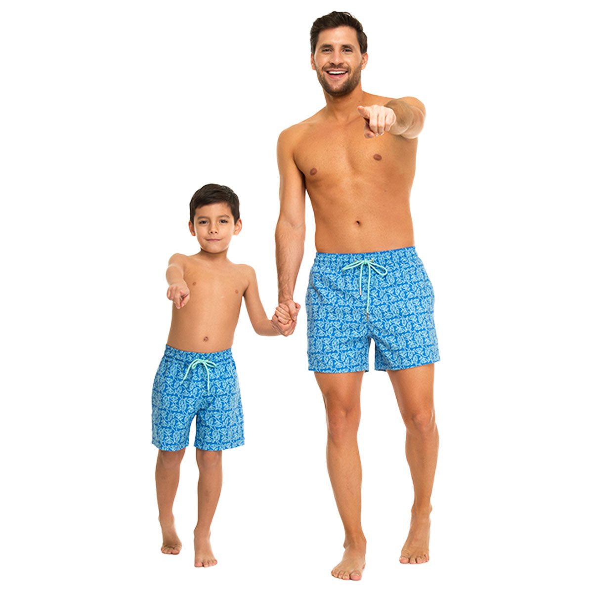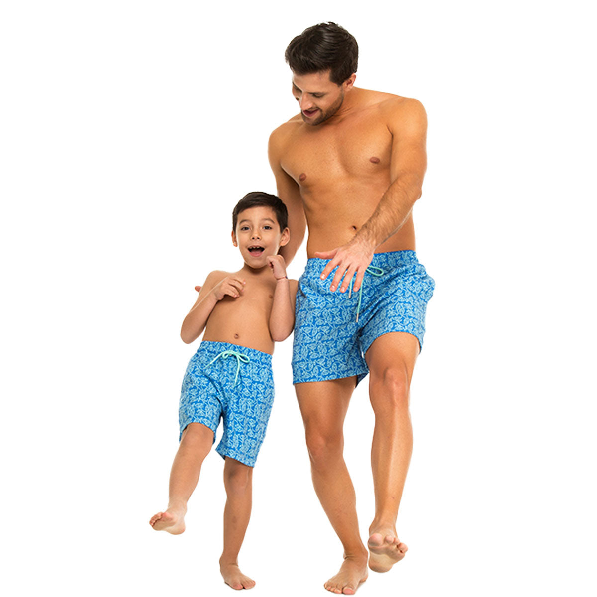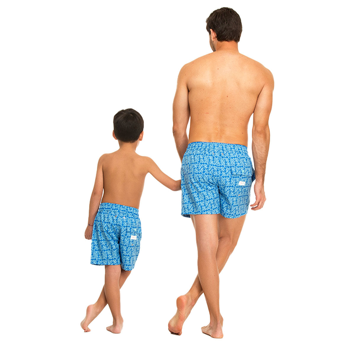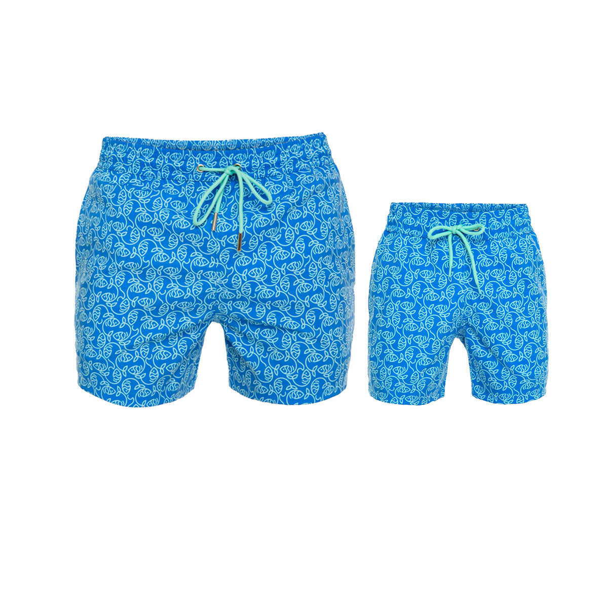 Embark on a journey with the Blue Essential Fishes matching swim shorts for fathers and sons from Tolu Australia, where each wave tells a tale of their adventures and every ripple narrates their shared journey. The subtle fish motif captures the tranquil underwater world and vibrant summer colours. Ideal for beach days, these matching swim shorts are a heartfelt symbol of family unity.