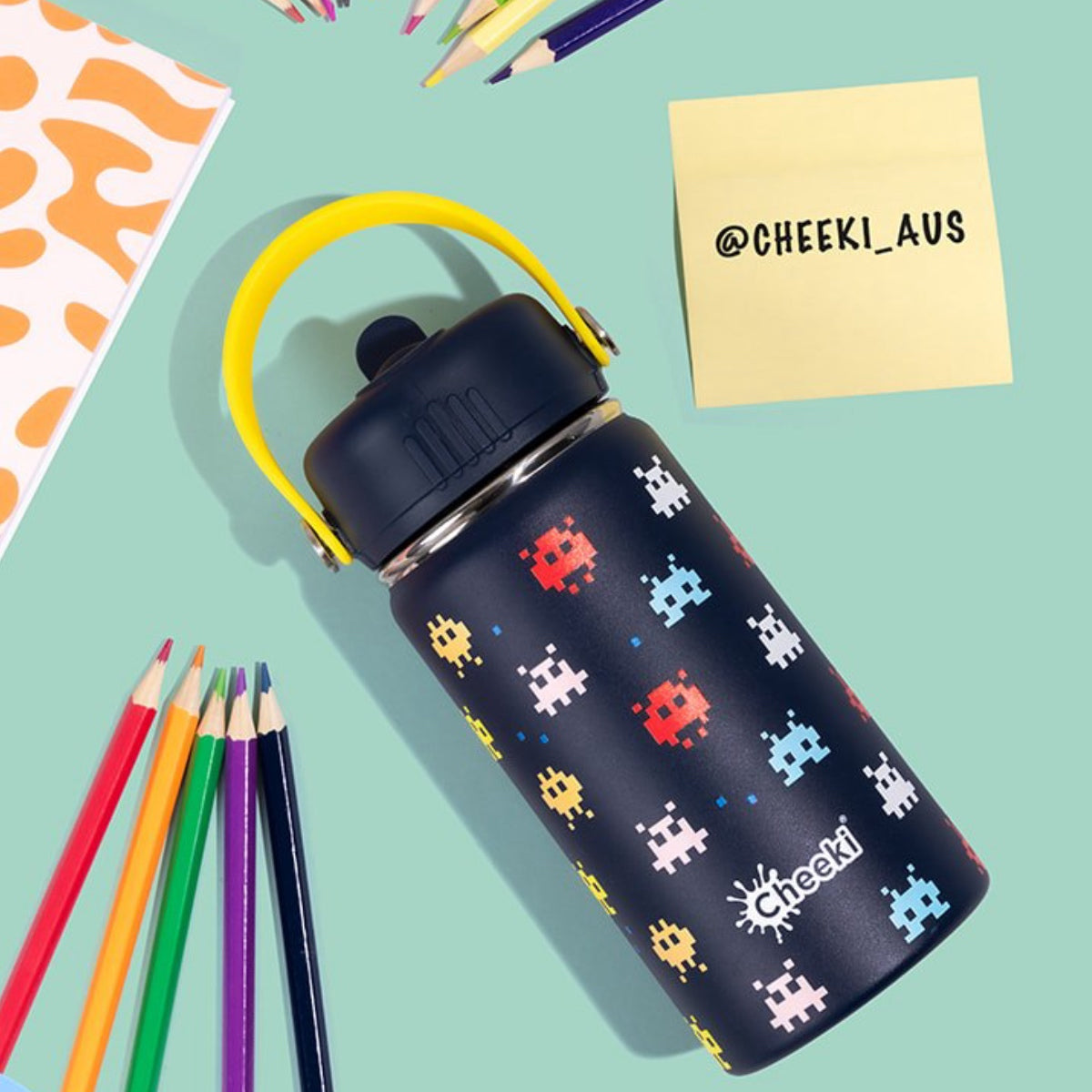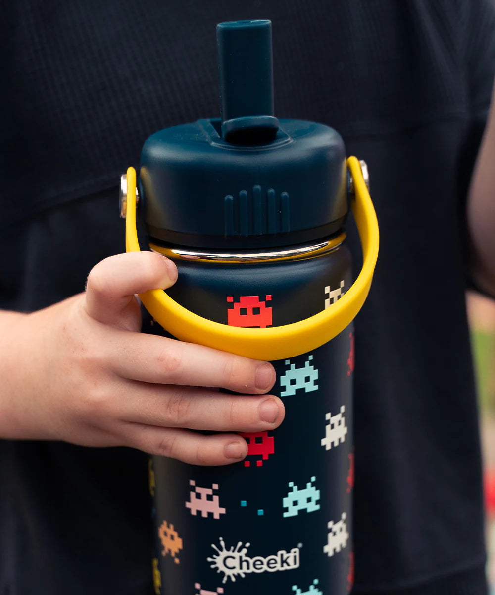 Our 400 ml kids’ insulated water bottle with Arcade designs, straw lid and soft handle is made for keeping little adventurers cool and hydrated while they explore, play, and learn.