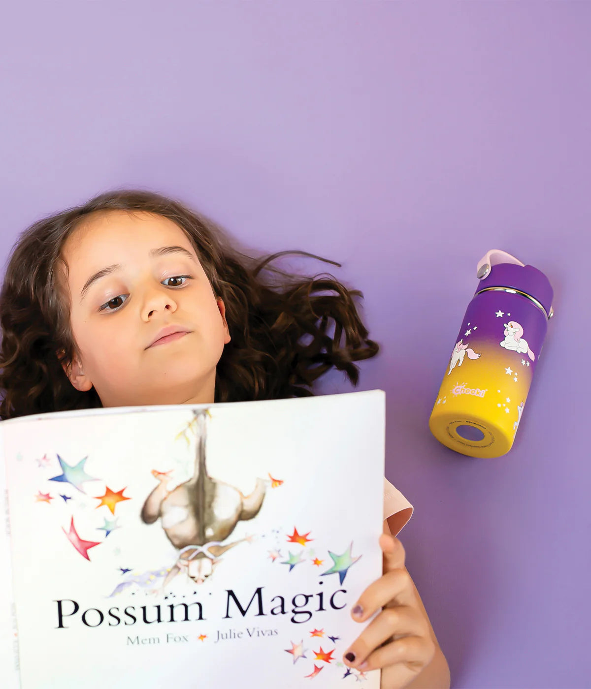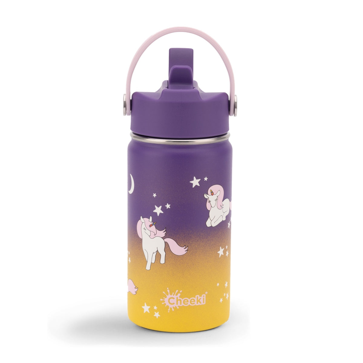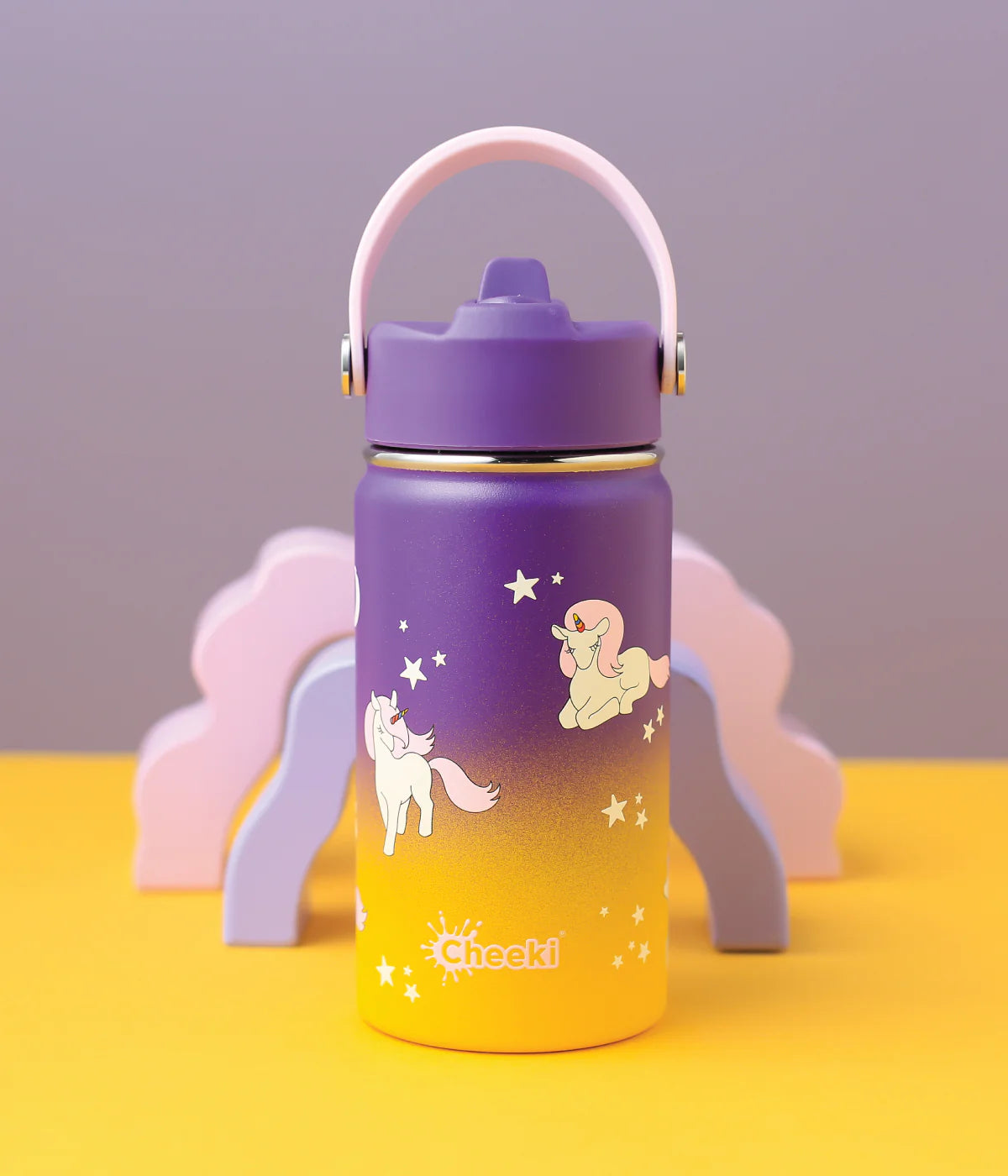 Our 400 ml kids’ insulated reusable water bottle with unicorns, straw lid and soft handle is made for keeping little adventurers cool and hydrated while they explore, play, and learn.