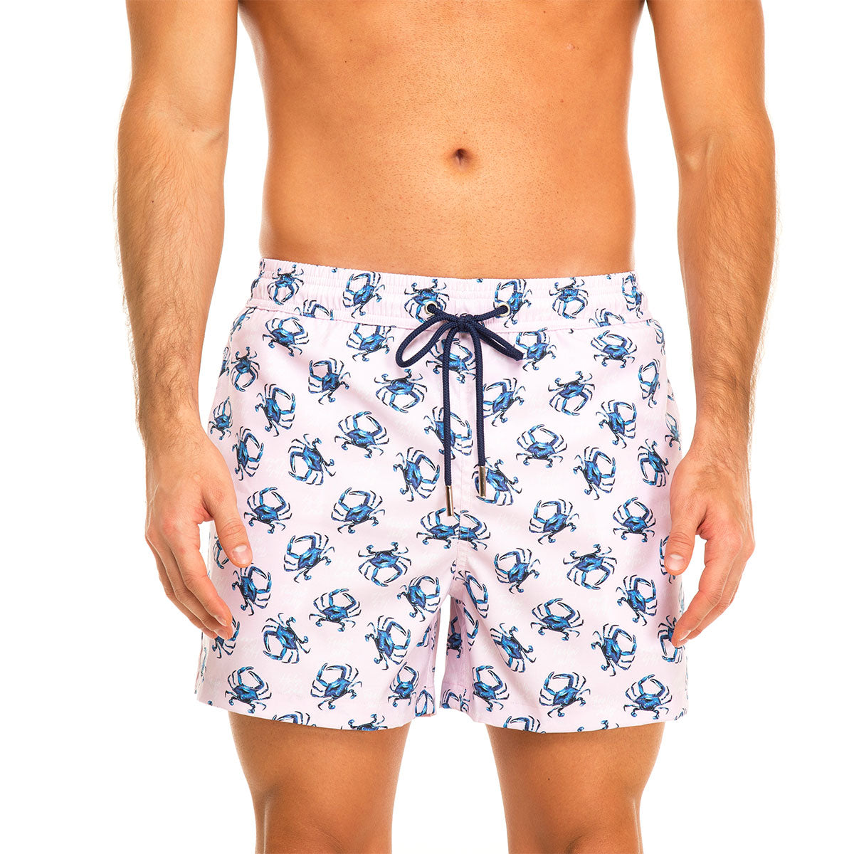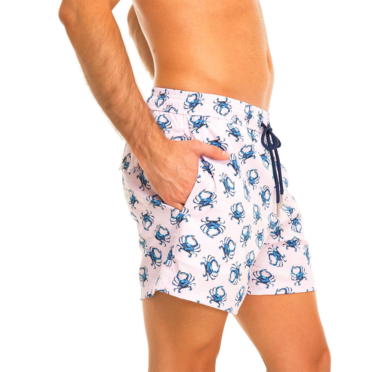 Men's swimwear, Blue crab patterns, Recycled polyester swim shorts, Quick-drying fabric, UV protection swimwear, Colombian made swimwear, Beachwear for men, poolside fashion, Elasticised waistband swim shorts, Sustainable swimwear, Eco-friendly swim shorts, Chlorine-resistant swimwear, Designer men's swim trunks, Exclusive digital print swim shorts, Fashionable beach attire, Summer vacation essentials, High-performance swimwear, Stylish swim shorts, Beach fashion for men, Trendy poolside looks