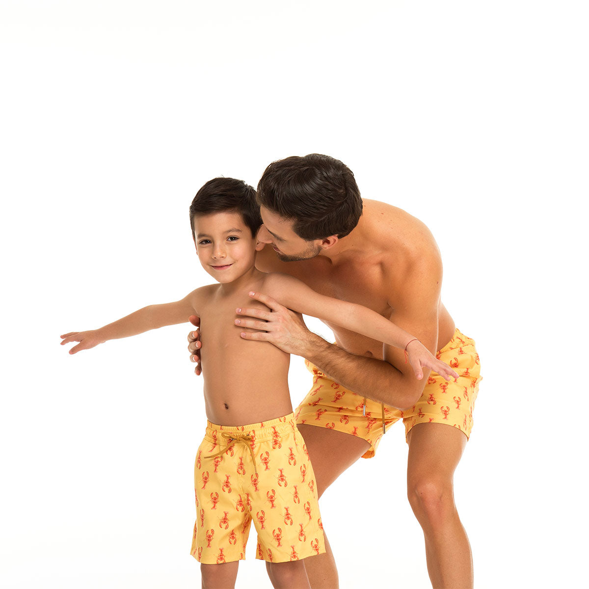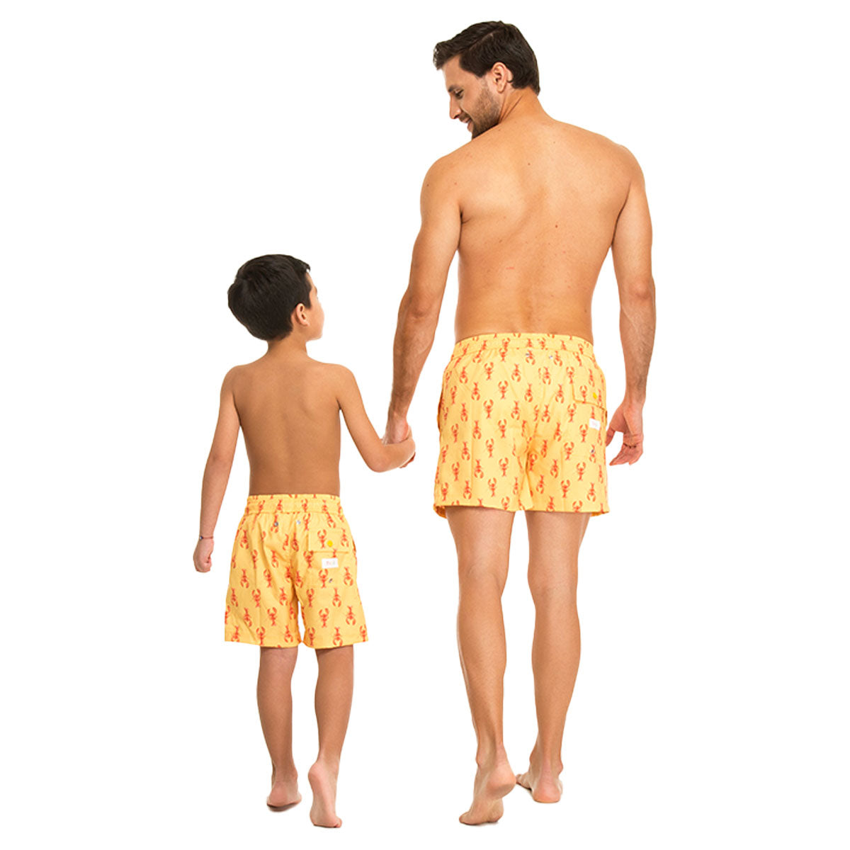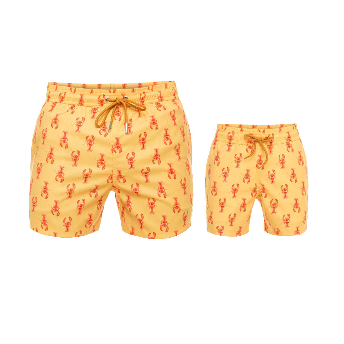 Presenting the Yellow Lobsters matching swim shorts for father and son by Tolu Australia, inspired by the vibrant essence of these crustaceans. These swim shorts embody vibrancy and character, designed to create lasting memories where each moment symbolises a shared journey between dad and son, fostering unforgettable family adventures.