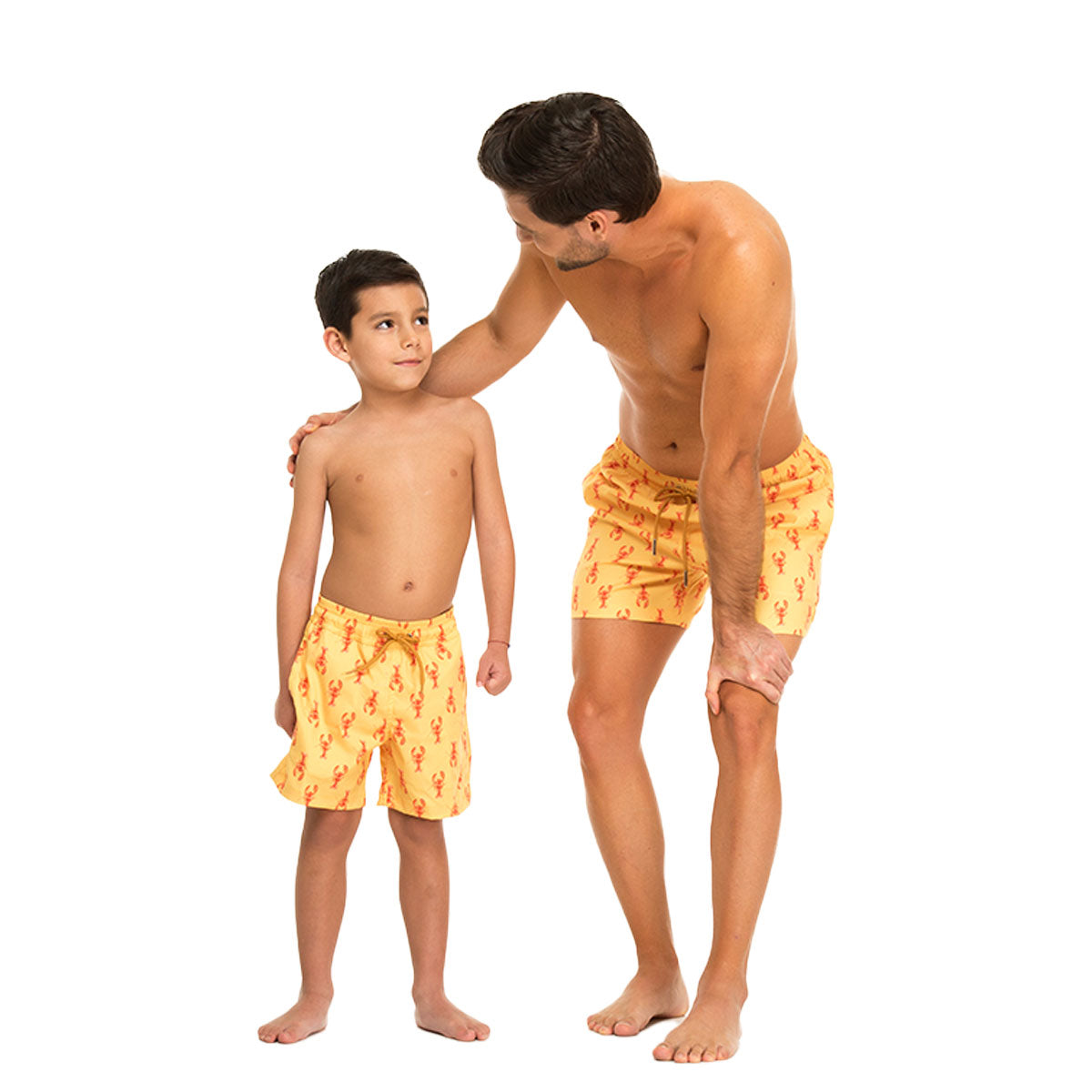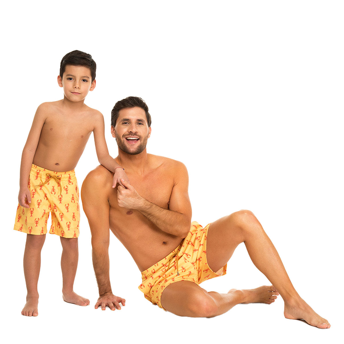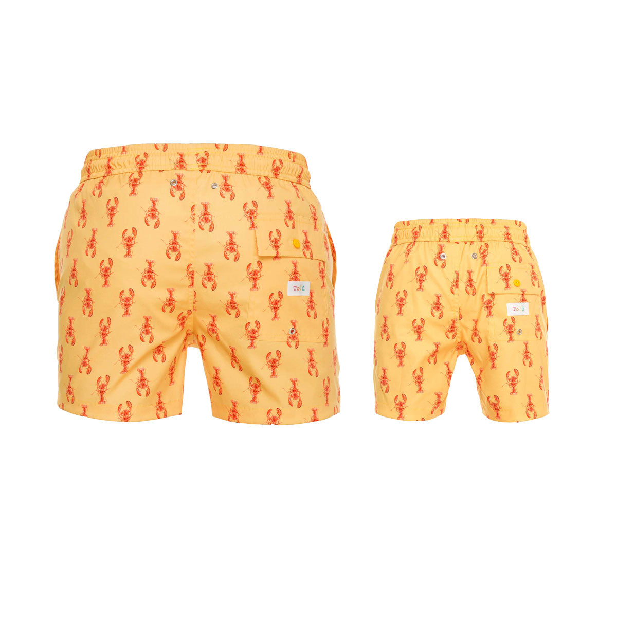 Presenting the Yellow Lobsters matching swim shorts for father and son by Tolu Australia, inspired by the vibrant essence of these crustaceans. These swim shorts embody vibrancy and character, designed to create lasting memories where each moment symbolises a shared journey between dad and son, fostering unforgettable family adventures.